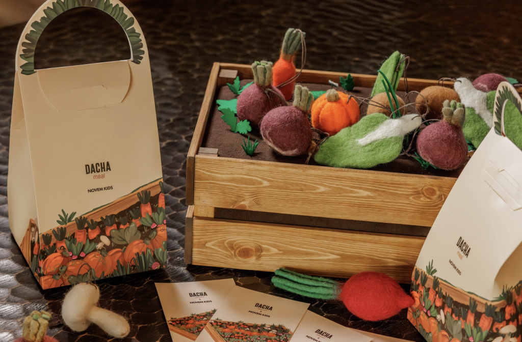 Ресторан Dacha вместе с российским концепт-стором для всей семьи NOVEM KIDS представили новый Dacha meal — детский обед c игрушкой, созданный с заботой о маленьких гостях и их родителях. Вдохновившись осенью, проекты добавили в набор изделия ручной работы в тематике сезонного урожая. В наборе: на выбор — чизбургер, чикенбургер или наггетсы, картофель фри или морковные палочки, сок или вода, на десерт — пирожок с вишней, а также игрушка. При заказе ребенок сможет выбрать ее из грядки, выполненной из ткани и дерева.