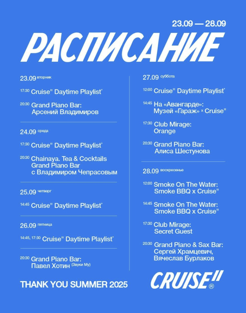 Cruise II by Kuznyahouse завершает сезон 2025 года неделей, в программе которой переплетаются авангард и камерные речные прогулки. В субботу нас ждет сет Orange — великого диджея и экс-арт-директора Simach — в рамках Club Mirage. В воскресенье выступит особый гость, чье имя узнают только гости этого рейса. Скажем лишь, что это дорогой друг как Cruise II by Kuznyahouse, так и петербургского лайнера.