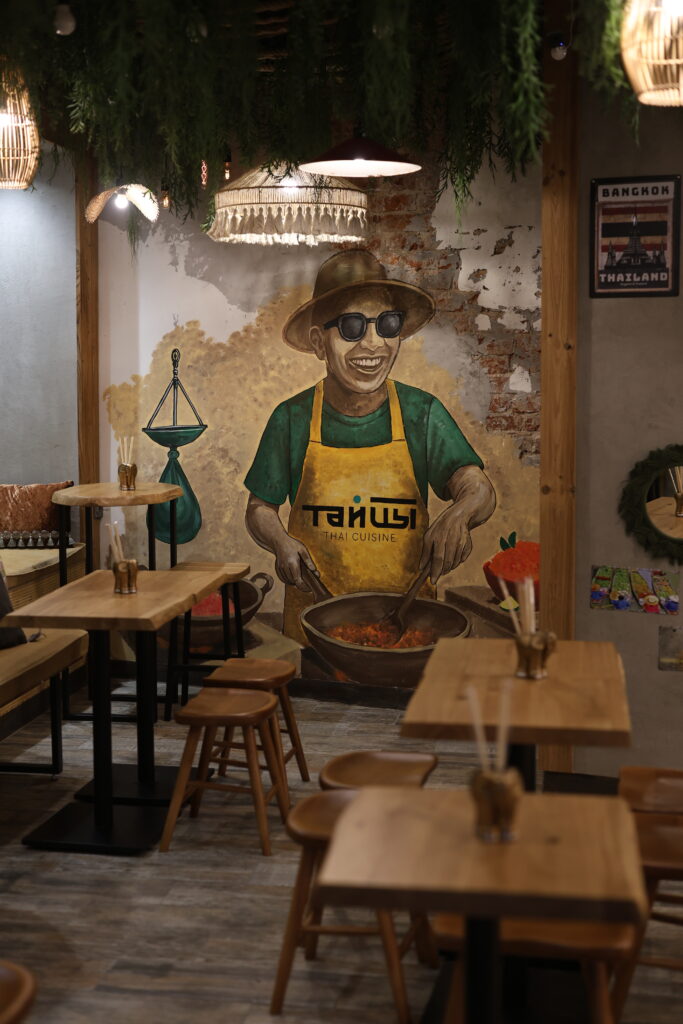 За гастрономическую концепцию гастробара ТАЙЦЫ отвечает шеф-повар Изат Аныбарбеков, с 12-летним опытом работы в паназиатской кухне. Его постоянные стажировки и обучение в различных странах Азии позволяют ему создавать тайские блюда по аутентичным рецептам, учитывая пожелания столичных гостей по остроте. Концепция кухни остается верной тайским рецептурам: традиционные супы том ям с морепродуктами и том кха с курицей, красный карри с морепродуктами, Пад тай, Пад капао кай и другие блюда. В меню гастробара ТАЙЦЫ вошли как уже полюбившиеся гостям блюда, так и новые позиции от шефа, включая барную карту и меню десертов.