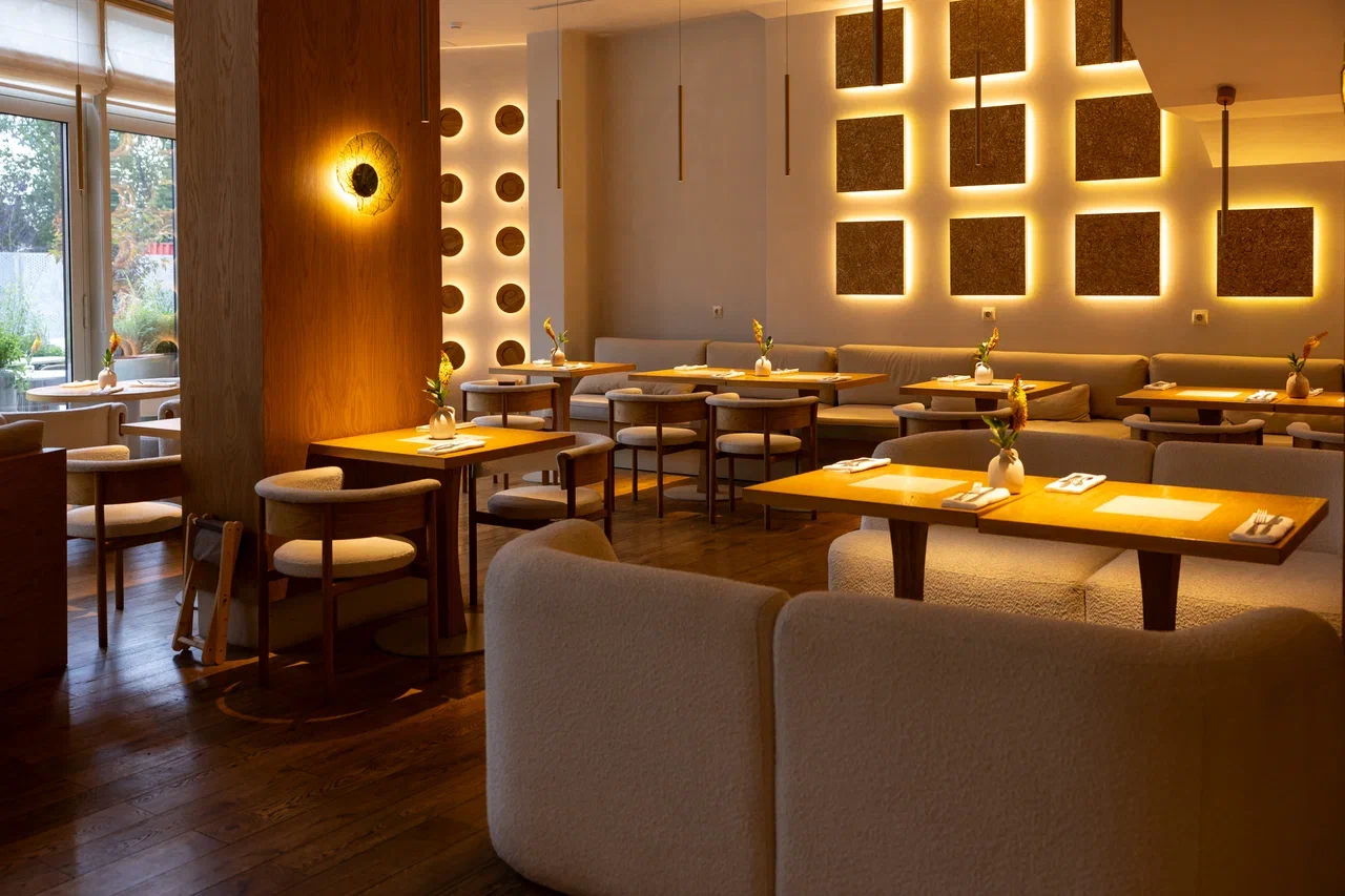 Философия проекта — Not only aesthetic: про замедление, тонкую эмоциональность и игру вкусов. Интерьер, созданный студией One Two Home и дизайнером Анастасией Золотаревой, гармонично сочетает искусство и природу. Песочные и сливочные стены выступают идеальным фоном для визуальных акцентов. Кухня под руководством шефа Андрея Иванова (Restaurant №13, «Северяне», Sansa) объединяет французскую утонченность и итальянскую простоту. Утро в NOA начинается с завтраков — здесь их готовят в течение всего дня. Основное меню строится на всемирной классике. Винная карта соединяет классику и редкие находки из Старого и Нового Света: от Франции и Италии до Новой Зеландии и ЮАР.