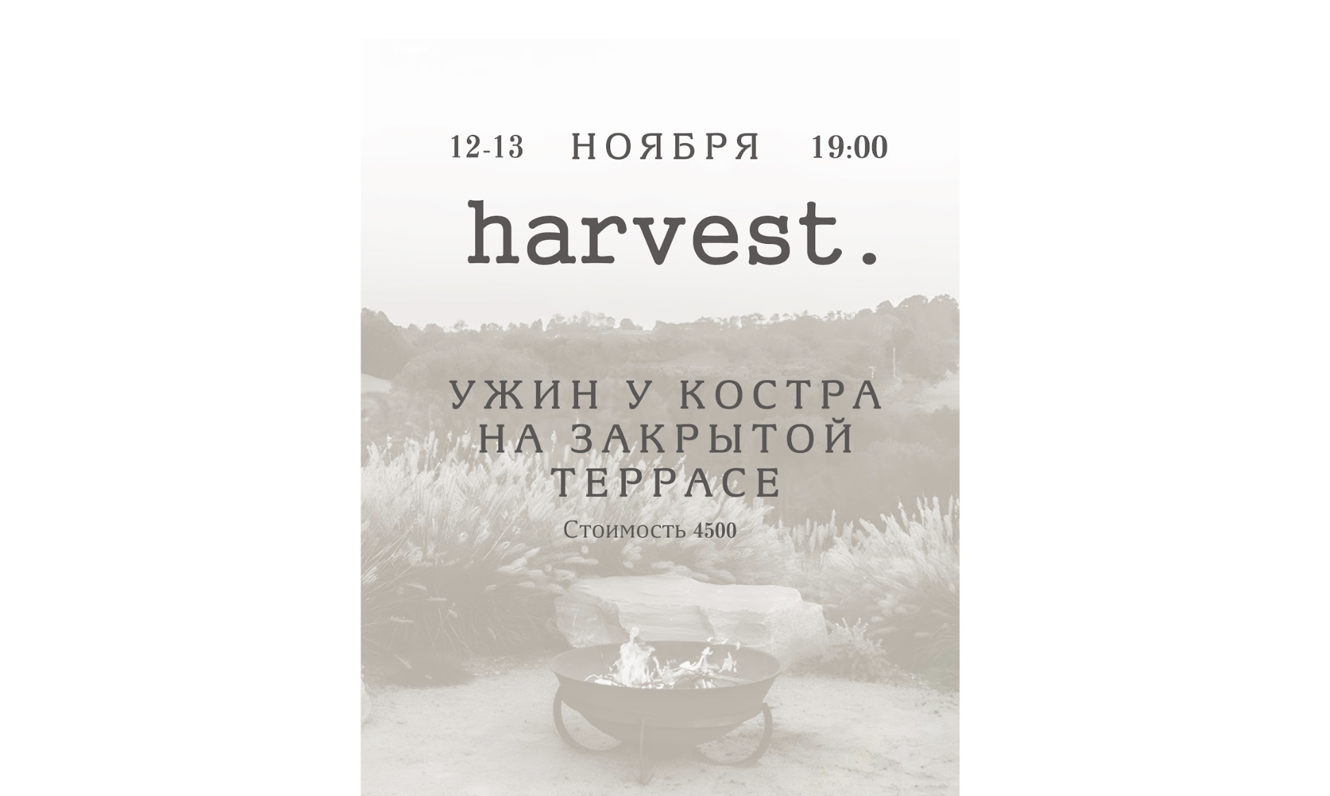 Ресторан Harvest приглашает на первый ужин в загородном стиле. На два вечера, 12 и 13 ноября, терраса превратится в уютное пространство, где шеф будет готовить блюда на открытом огне. Прямо с открытого огня на стол отправятся горячие блюда — те, что всегда хочется пробовать вместе и передавать друг другу: куриное бедро с мягкой пряностью карри и ароматом лайма; угольная рыба в мисо-маринаде с лемонграссом; томленая в фольге лопатка ягненка, нежная и насыщенная, с дымным акцентом BBQ. Все подается в стол, чтобы делиться, как принято на выездах с близкими.