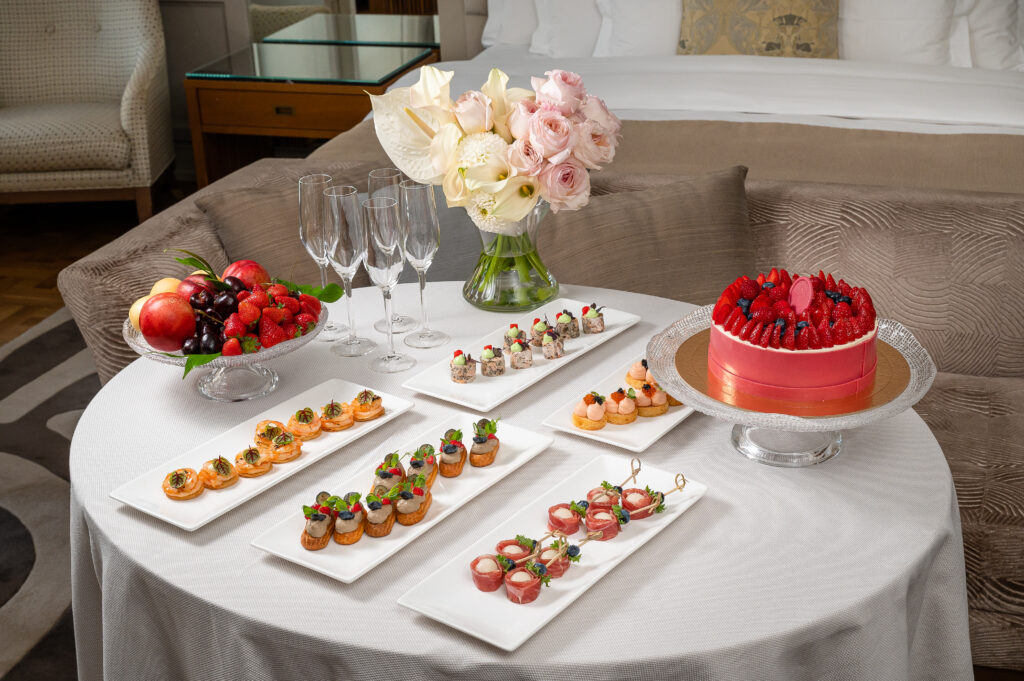 На столе — гастрономические сеты от шеф-повара, праздничный торт, ваза со свежими фруктами и ягодами, игристое, изысканный букет для невесты и цветочные браслеты для ее подружек. Особые комплименты — это travel-наборы уходовой косметики Elemis и сертификат на посещение Центра красоты и здоровья «Белый Сад», чтобы индивидуально подобрать программу перед торжеством. Вечер завершается яркой коктейльной церемонией с сезонным гастросетом в Гранд-лобби & баре «Шаляпин».