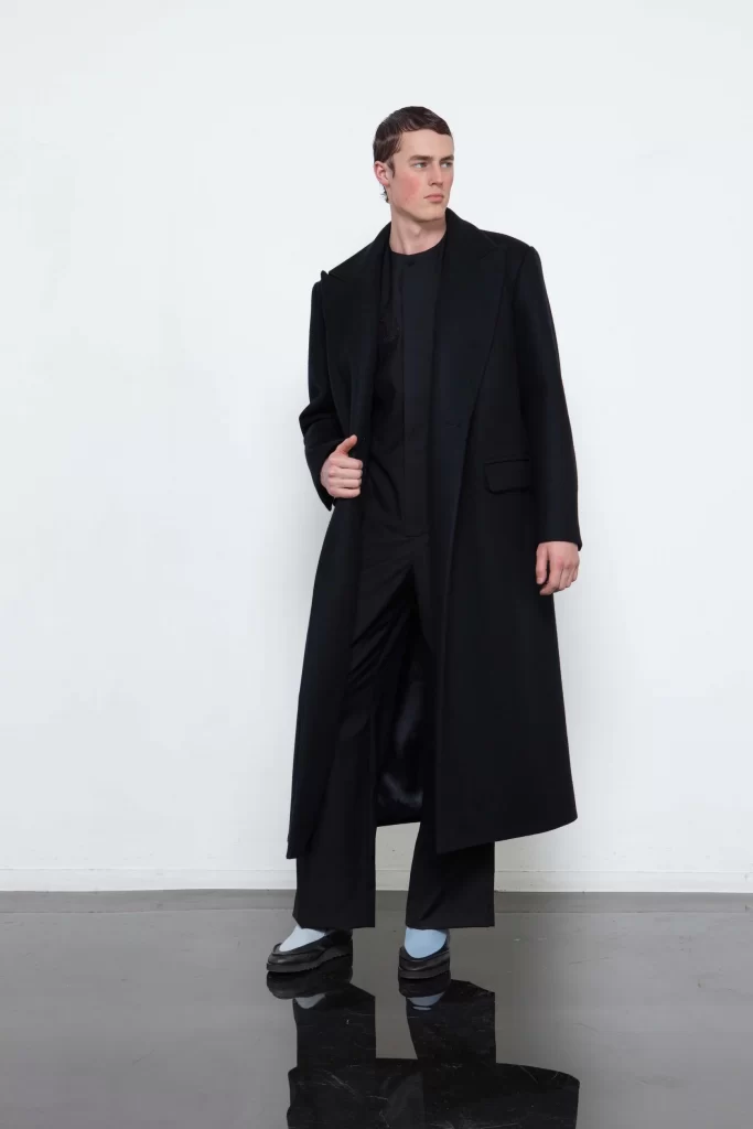 - Chernim Cherno, 52 500 рублей — длинный вариант из 100% австралийской шерсти с асимметричным бортом с закругленным низом. Пальто застегивается на две прорезные глазковые петли и пуговицы. Спинка выполнена с двумя высокими шлицами и широким регулирующимся хлястиком. Головным убором может стать шапка-бини или кепка-восьмиклинка.