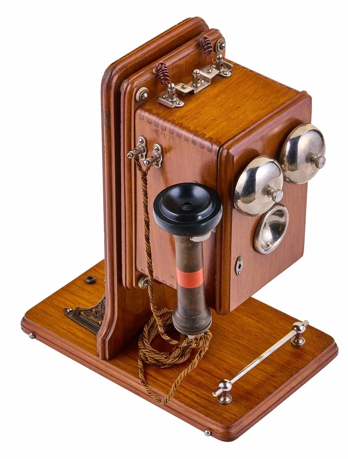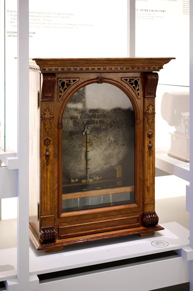 Политехнический музей предоставил для выставки одну из самых ранних моделей телефона — аппарат конструкции Александра Белла. По легенде, во время работы с прототипом устройства Белл случайно пролил на себя кислоту и позвал на помощь ассистента. Тот был в соседней комнате, но услышал крик Белла из включенного аппарата. Их короткий разговор стал первым телефонным звонком в истории.