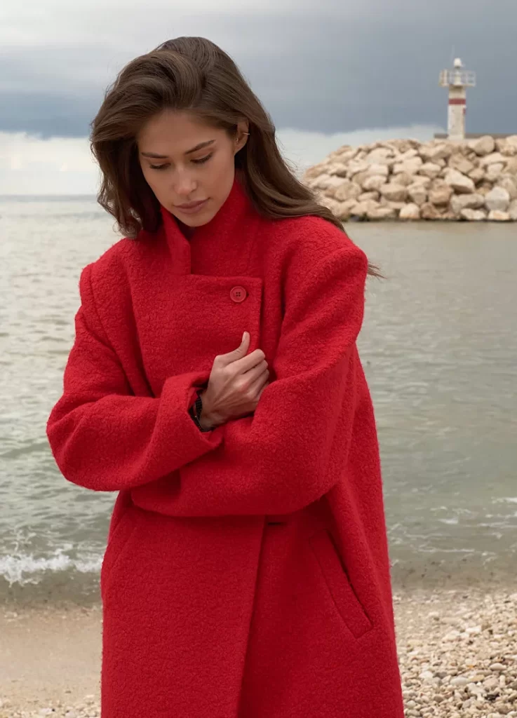 - Voishe, 34 990 рублей — насыщенная красная модель выполнена из итальянской шерсти. Изделие прямого силуэта застегивается на потайные пуговицы и дополнено прорезными карманами. Можно добавить сюда любимый ремень или повязать на талию плотный теплый шарф. И, конечно, не забываем утеплять руки и брать с собой перчатки.