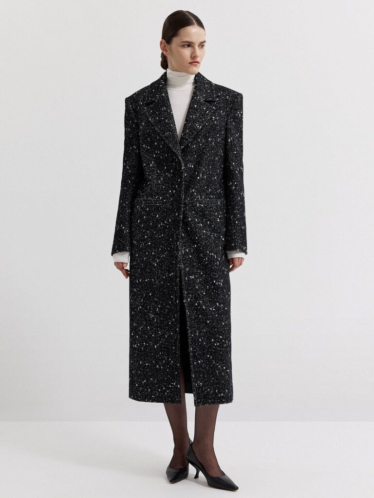 - CHARUEL, 35 990 рублей — вариант из твида с расширенными плечами «в елочку» содержит натуральную шерсть и волокна акрила, чтобы новинка не продувалась и служила на протяжении многих сезонов. Носим ее при температуре от 0 до +10 градусов. К такой модели подойдут однотонные простые элементы гардероба: водолазки, рубашки, брюки с защипами и джинсы.