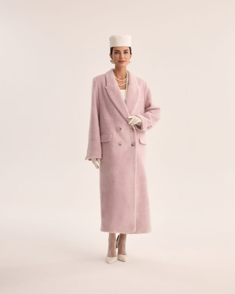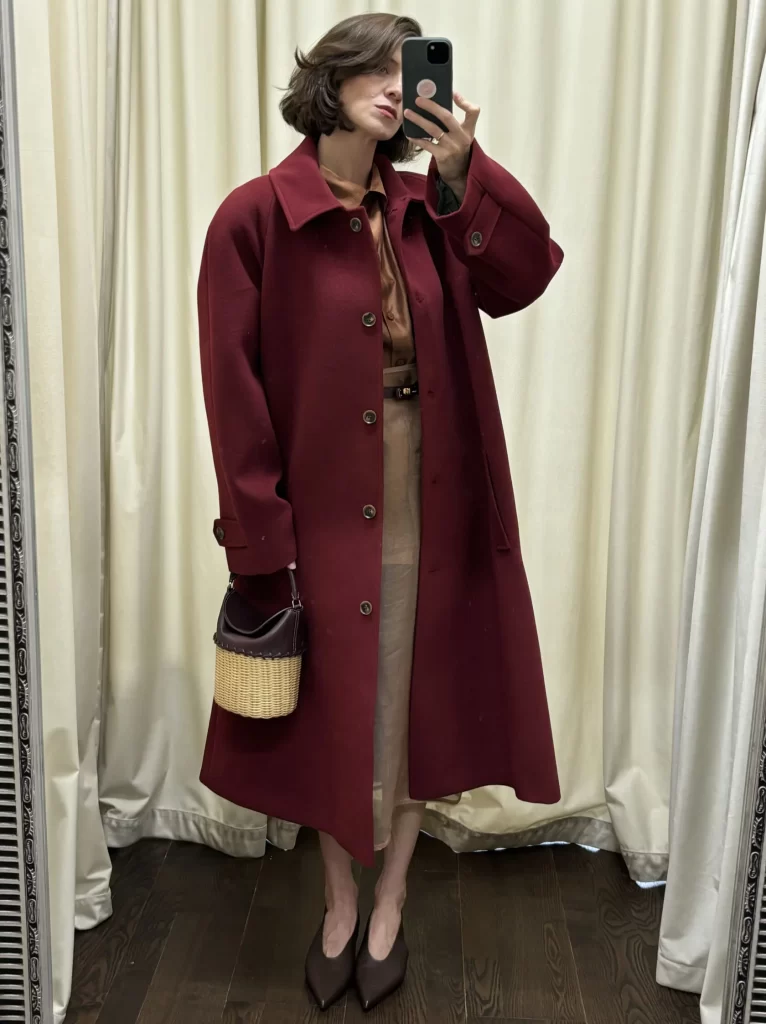 - Ivolga, 29 200 рублей — бордовое пальто в стиле 1960-х обладает мягким силуэтом и чуть заниженной линией плеч. Свободный крой позволит носить покупку в двух вариантах: расслабленном нараспашку и с добавлением пояса. Изделие доступно в едином размере. Дополните его теплыми шляпами и очками в форме «кошечки».