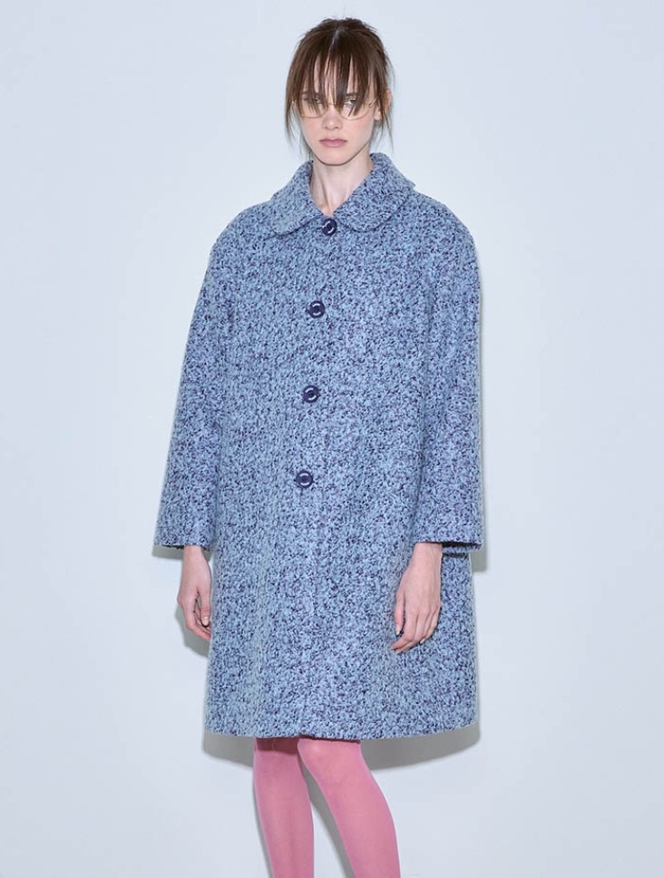 - Rogov, 40 000 рублей — очаровательный голубой вариант до колена дополнен крупными пуговицами с названием бренда. Эффект кудрявой ткани и ретроэстетика в вашем образе выводят пальто на первый план. Поддерживаем его высокими, светлыми сапогами, контрастным шелковым платком на голову и миниатюрной сумкой.