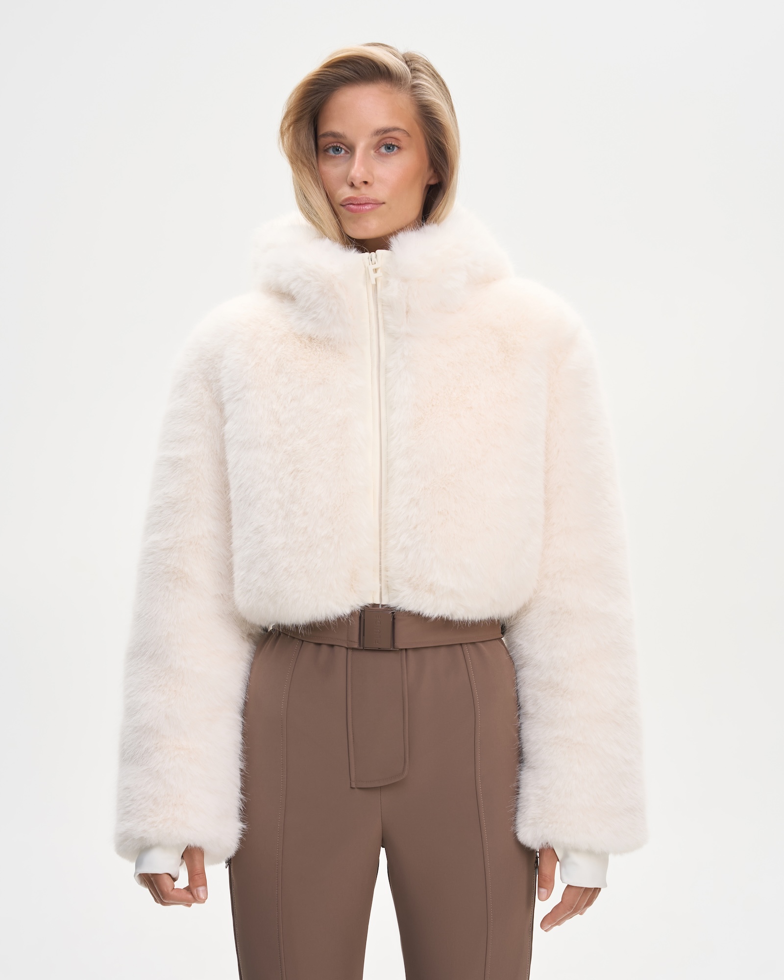 - Fluide, 79 900 рублей — по-настоящему стильная модель приталенного силуэта с капюшоном, карманами, поясом, манжетами и двойными брюками на резинке. В составе многофункциональная ткань и мех с дополнительным слоем утеплителя из флиса. Внутренняя планка также сохраняет тепло. Отлично подойдет для носки вне зимних курортов.