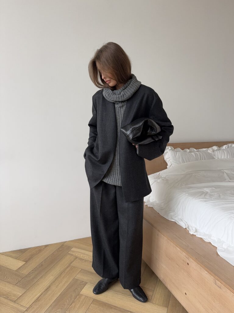 В разделе верхней одежды появилось черное пальто из буклированной мягкой шерсти. Созданная в свободном силуэте, модель позволит носить объемные вещи: джемперы, жакеты, свитшоты. Шоколадный же вариант длиной до щиколотки дополнили поясом. Изделие выполнено без подклада, чтобы сохранить максимальную легкость.