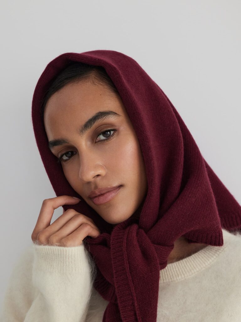 - Косынка, Monncashmere, 17 980 рублей — модель из 100% премиального кашемира в глубоком бордовом оттенке можно носить несколькими способами: на плечах, повязывая на голову или даже на талию. Стирайте изделие в режиме «Шерсть/шелк» в холодной воде. Всего доступно пять оттенков, включая привычные базовые.