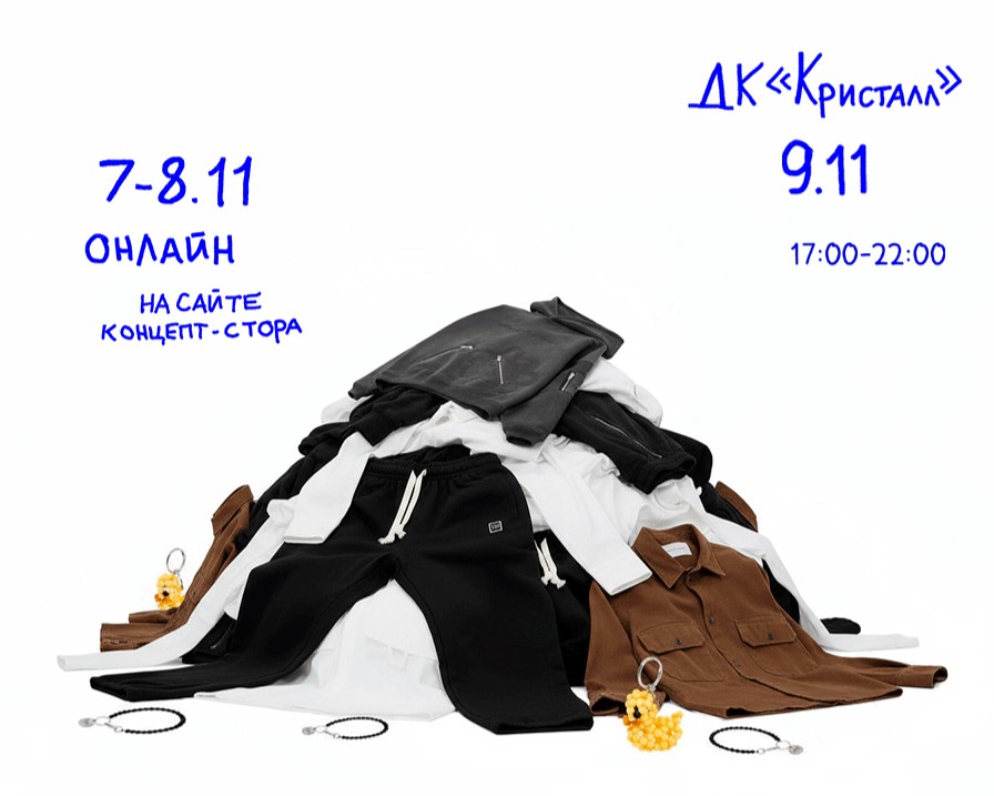 В воскресенье, 9 ноября с 17:00 до 22:00 в ДК «Кристалл» — большой гараж-сейл от ДИСКО КЛУБ КОНЦЕПТ СТОР, ДИСКО КЛУБА и SYSTEM 108. Ребята делают мерч уже целых 5 лет: футболки, худи, рубашки, брюки, шорты, носки, виниловые пластинки, мебель, картины, украшения, жилеты и даже ковры, и теперь достают из архива все, что осталось. Здесь можно будет урвать: старые дропы, остатки размеров, мерч артистов, последние экземпляры. Цены будут снижаться каждый день, в формате редукциона, скидка 70%-80%-90%.