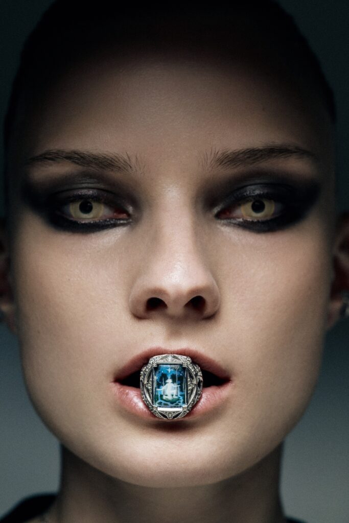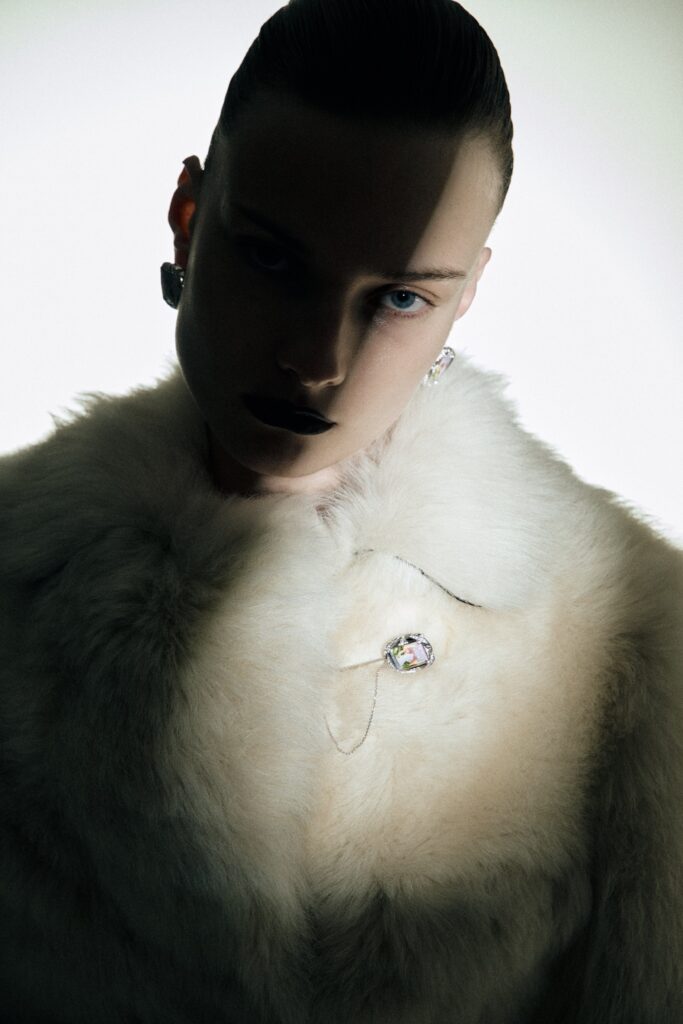 В коллекцию вошли перстни, серьги, броши и колье с финифтью, а также дополняющие их кольца и каффы из серебряных звезд с топазами. Брошь выполнена в форме корсажной булавки и дополнена закруткой на винтовой резьбе, напоминающей навершие меча.