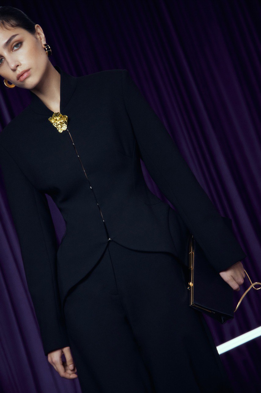 Женщина в коллекции — воплощение идеального тела и характера, который достойно обрамляет эта одежда. Среди тканей: шелк, сухая шесть, струящиеся драпировки, прозрачные текстуры. В коллекцию вошли брюки с разрезами и высокой посадкой клеш, строгие жакеты, откровенные декольте, украшенные полудрагоценными камнями.