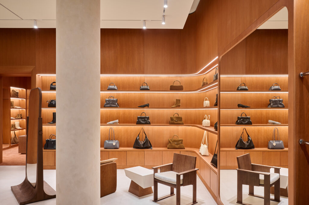 В самом большом магазине ASKENT особое внимание уделили обуви, подчеркнув новую важную главу в развитии бренда. Здесь обувная зона стала полноценным и самостоятельным участником пространства. Полностью выполненная из дерева, она выделяется на фоне общего дизайна бутика и представляет собой уединенную комнату с мягким ковролином в тон древесине.