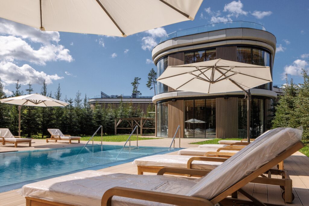 Снаружи — аромат смолы и хвои, а внутри — четыре разряда: женский, мужской, в которых есть отдельные кабинеты для уединения компаний, общественный и три VIP. В женском построили самую большую в России парную из липы с 12-тонной печью и хаммамом со звездным небом. Для женщин предусмотрели четырехчасовое парение, чтобы ничто не отвлекало от времени наедине с собой. В мужском — две парные на 130 гостей, собственный двор с двумя большими купелями контрастных температур и террасой, где можно отдохнуть на сеновале. Для компаний и семей предусмотрен общественный разряд, где они могут встретиться в панорамной травяной парной.