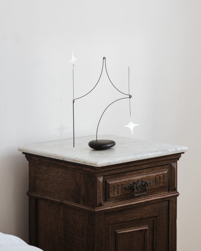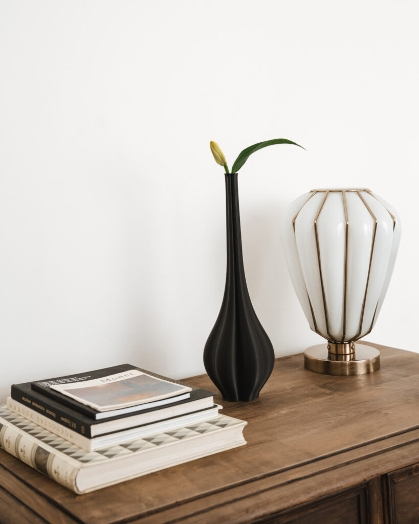 Архитектурное бюро figura A переосмыслило свою вазу Tears M, напечатанную на 3D-принтере из экологичного материала. Студия kinetic levi создала настольный мобиль — объект, реагирующий на малейшее движение воздуха. Это одновременно символ бесконечного потока информации и напоминание о важности замедления в цифровой среде.