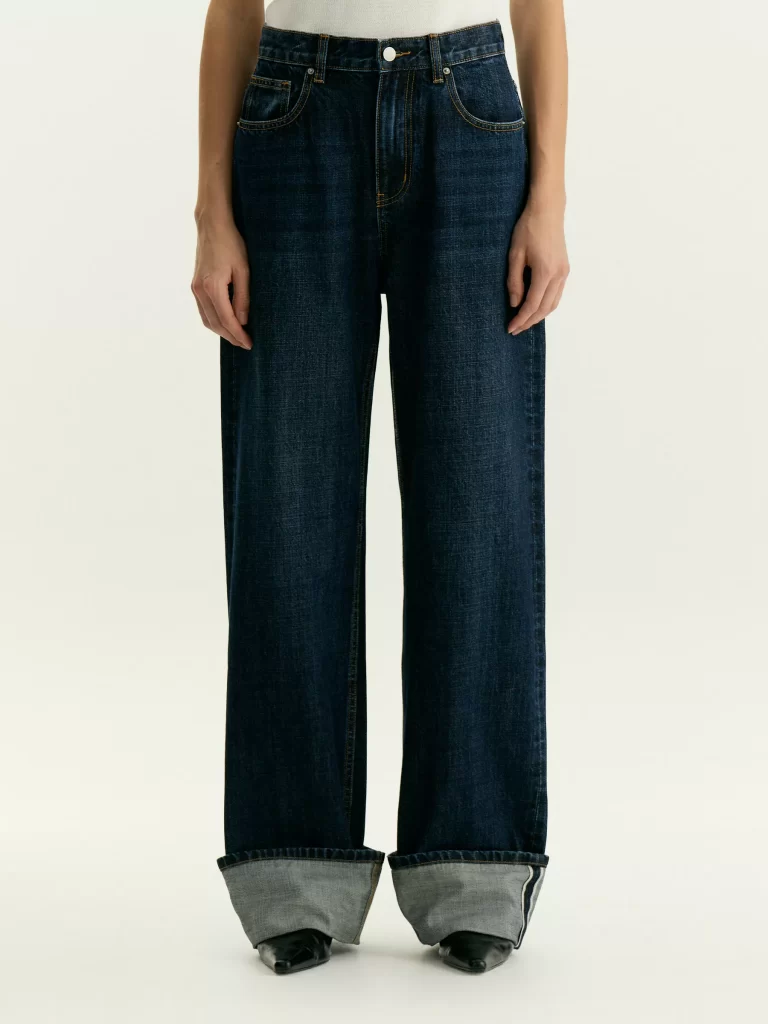 Дубленка из экокожи на мягком искусственном меху с широкими меховыми манжетами — еще одна универсальная вещь гардероба на ноябрь. Носим до -5 градусов. Высокий воротник укроет шею от ветра и холода. Составить простой, но актуальный образ предлагаем со свободными джинсами из органического хлопка на высокой посадке. Отвороты на брючинах добавят изделию акцентов.