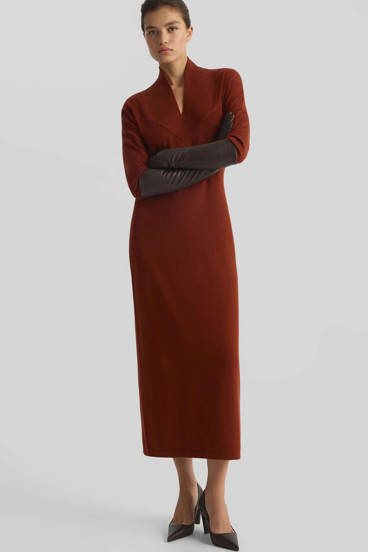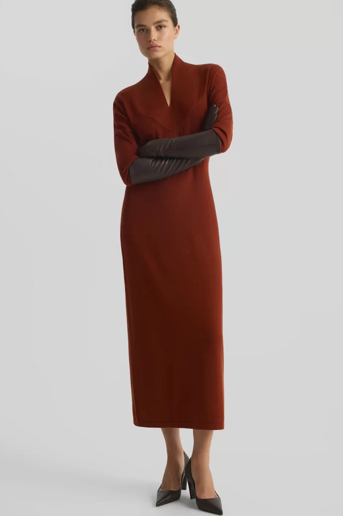 • 2MOOD, 11 980 рублей — платье длины миди со стильным V-образным вырезом и воротником-стойкой. Рукав сделан с высоким облегающим рибом и идет до локтя. Модель из мягкой износоустойчивой пряжи плотная, хорошо держит форму и почти не мнется. Стилисты предлагают носить ее с подчеркивающими талию аксессуарами и длинными перчатками.