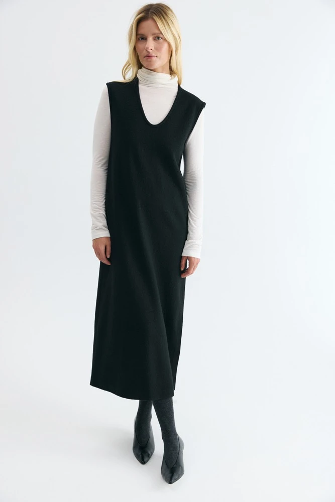 • DAISYKNIT, 9534 рубля — черная модель из стопроцентной шерсти без рукавов с глубоким U-образным вырезом. Ее легко сочетать с тонкими водолазками или свитерами, классическими рубашками и атласными блузами. Для изделия подходит исключительно ручная стирка или химчистка. По желанию добавьте сюда миниатюрные аксессуары.