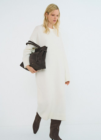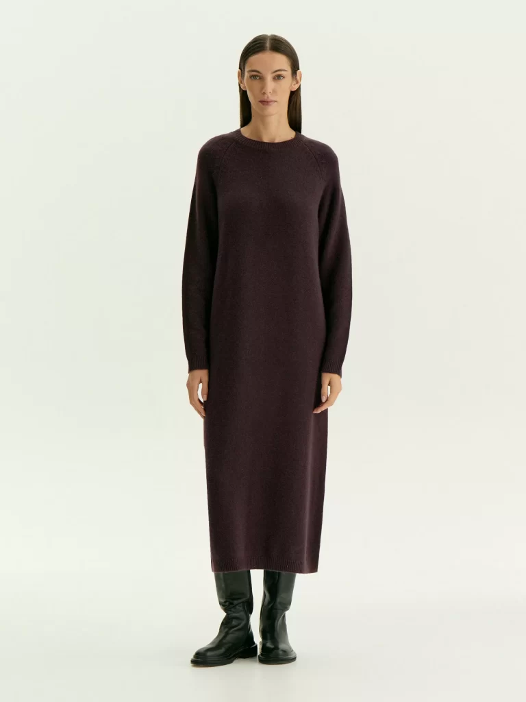 • Emka, 23 990 рублей — платье цвета инжира выполнено с большой долей шерсти мериноса и добавлением нейлона. По заявлению марки, в нем тепло и мягко, а еще изделие не колется. По горловине и по низу рукавов выполнена вязка резинкой. В таком платье будет уютно провести выходные за городом, сходить за покупками или сходить в гости.
