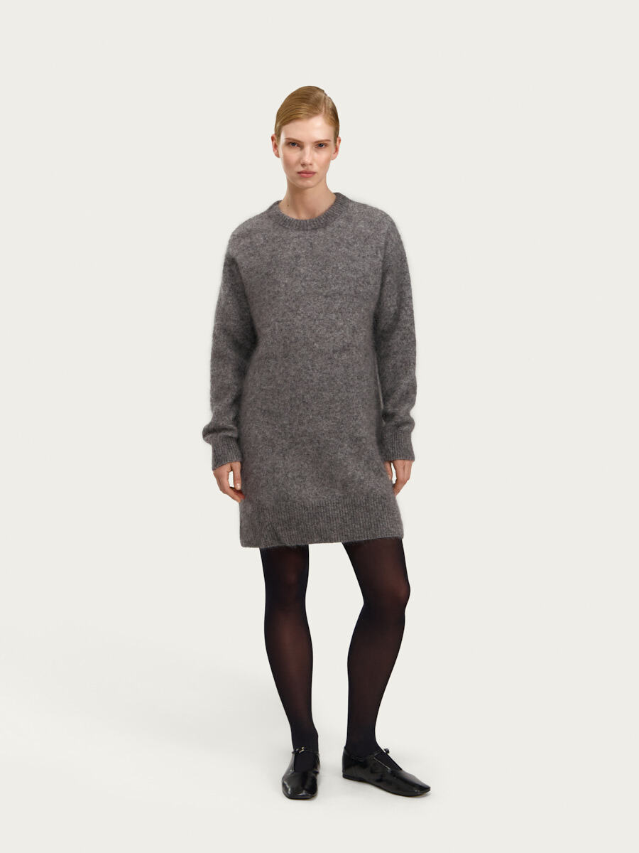 • GATE31, 28 990 рублей — модель из пушистого мохера мелкой вязки имеет спущенную линию плеча и округлый вырез горловины. Длина выше колена предполагает дополнительное утепление нижней части тела — используйте плотные колготки. Стилизовать можно с контрастными шарфами и обувью, крупными подвесками и сетами колец.