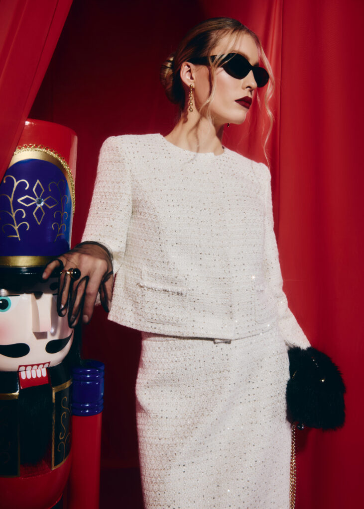 Молочный твидовый костюм украсили россыпью мельчайших пайеток — новинка безупречно выглядит в свете софитов и вспышек камеры. Прямой укороченный жакет с отрезным бочком сделан на кнопках с накладными карманами, а юбка полуприлегающего силуэта — на притачном поясе с застежкой на потайную молнию. Цена указана за весь комплект.
