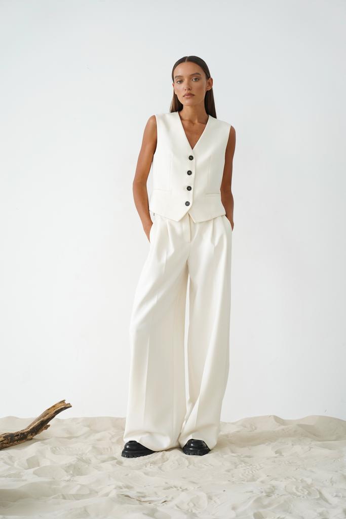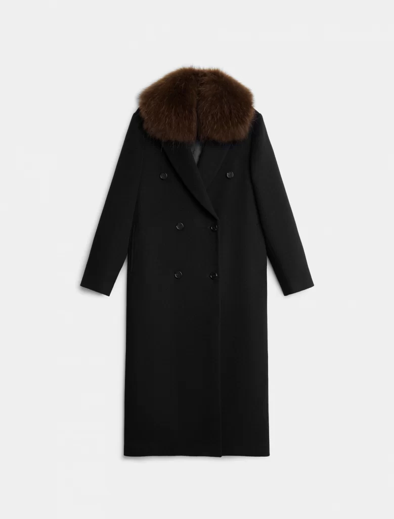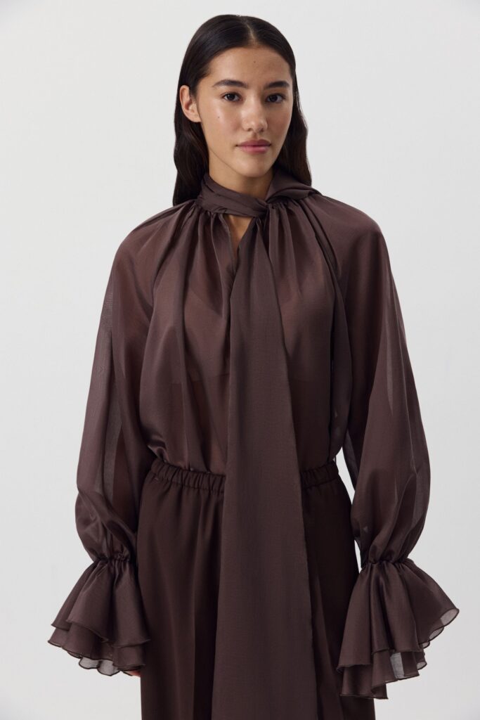 Собираемся на деловую встречу или кинопремьеру в шоколадной блузе из тенсела, украшенной крупным бантом, брюках широкого кроя с завышенной талией и коричневых ботильонах из натуральной кожи. Сверху накидываем шерстяное двубортное пальто с меховым воротником, а руку украшаем кольцом из желтого золота с турмалином и бриллиантами.