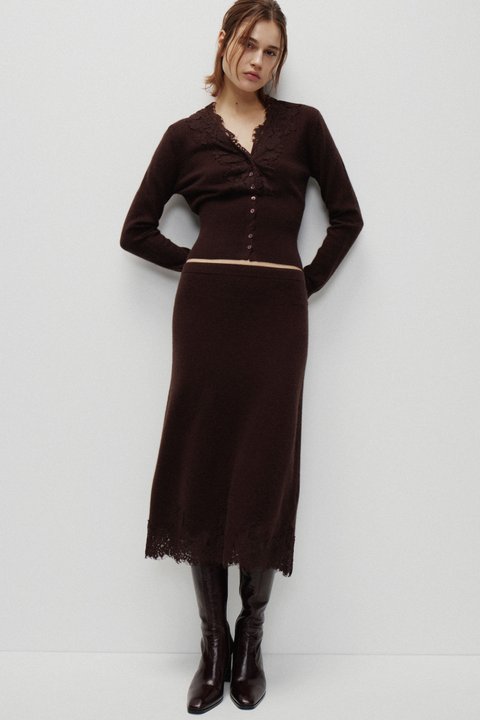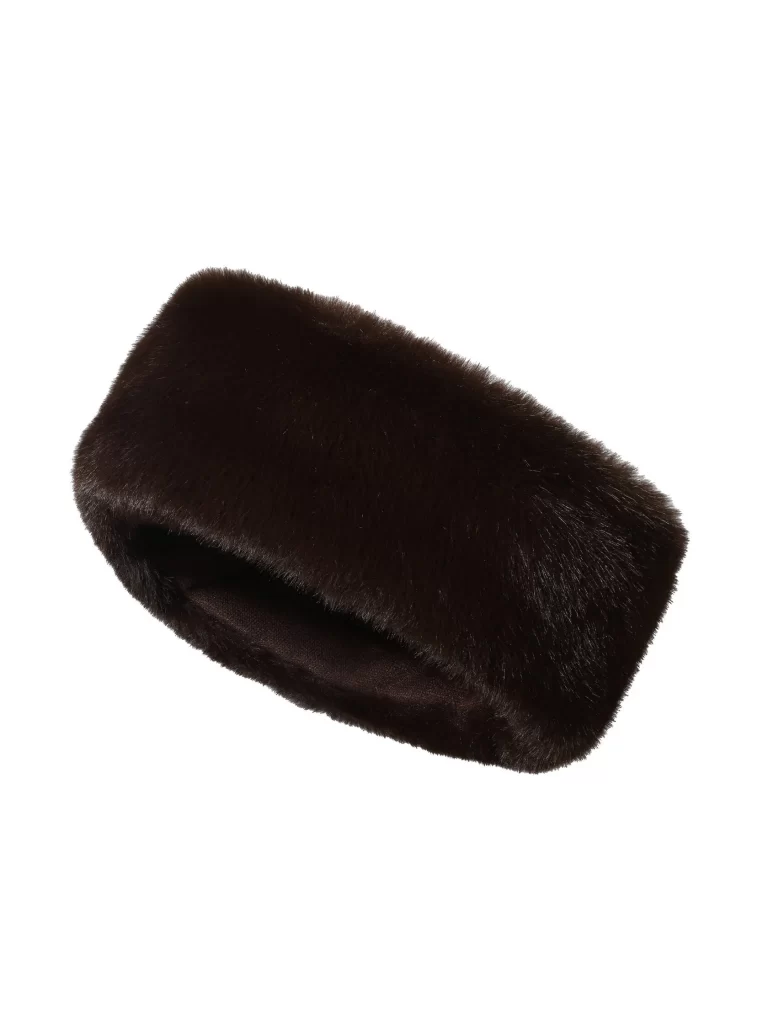Составляем образ с кардиганом из трикотажа и кружева в коричневом оттенке, широкими джинсами на высокой посадке и замшевыми ботинками на меху. Добавляем меховую повязку из экоматериала и крупную светлую сумку из натуральной кожи. Можно заменить головной убор на мягкие, теплые наушники или кружевной платок.