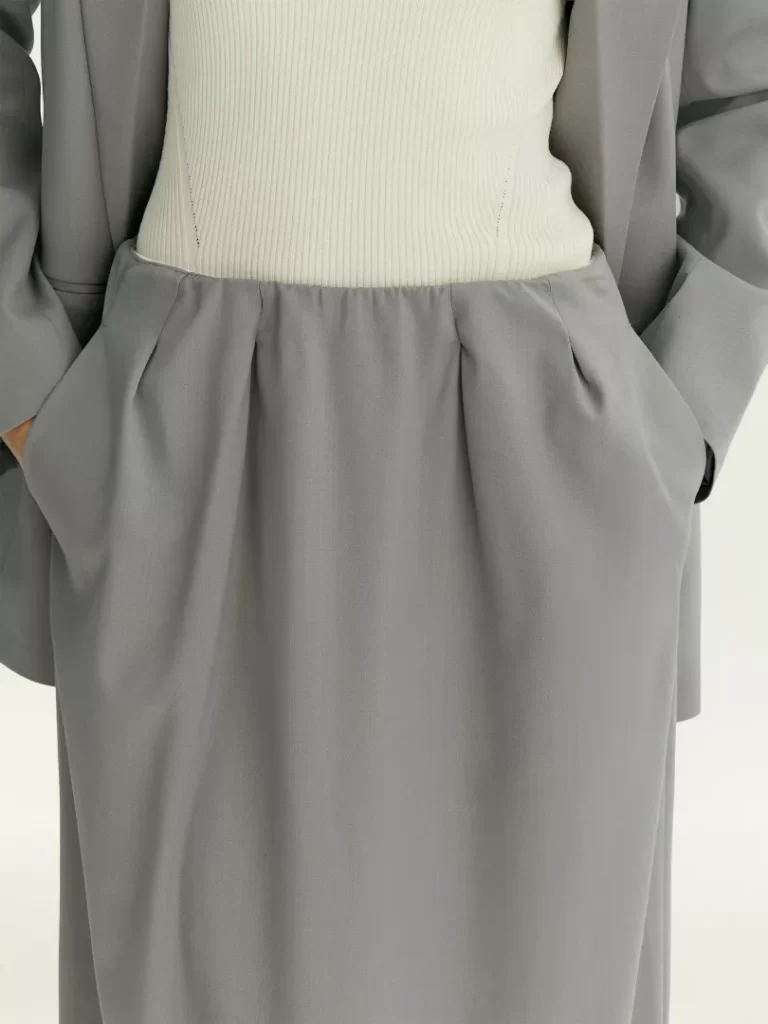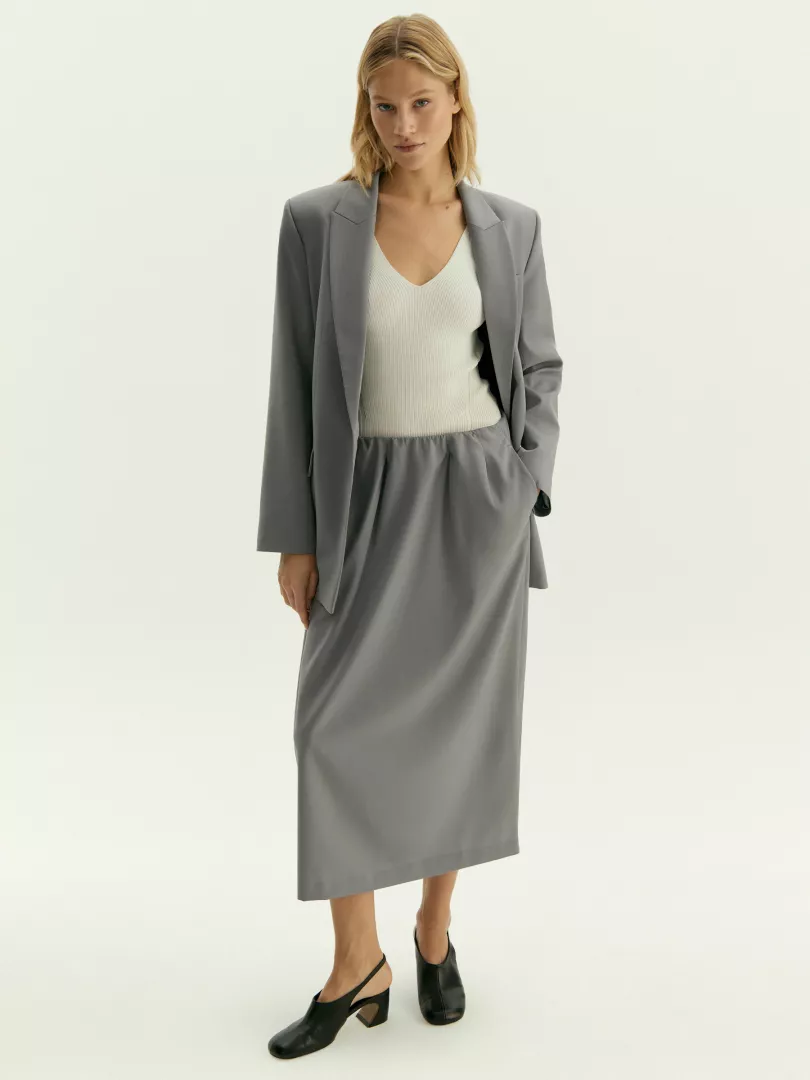 Из новой коллекции выбрали для себя юбку длины миди с защипами. Модель выполнена без подкладки и застежек, в талии предусмотрена удобная резинка, которая четко посадит изделие по фигуре. В составе новинки шерсть и немного эластана для придания эластичности и свободы движения. В ассортименте можно найти аналогичный пиджак для создания комплекта.