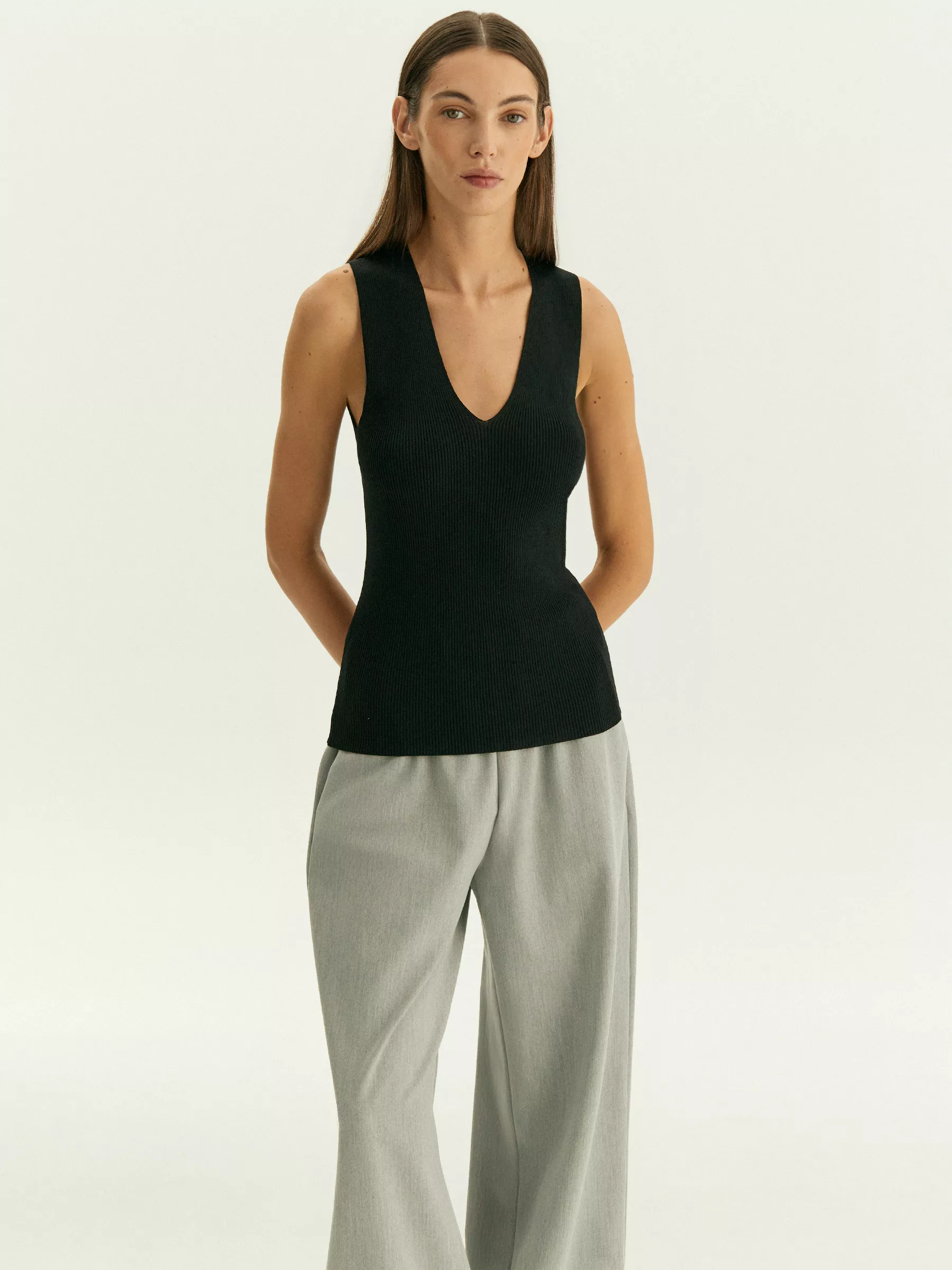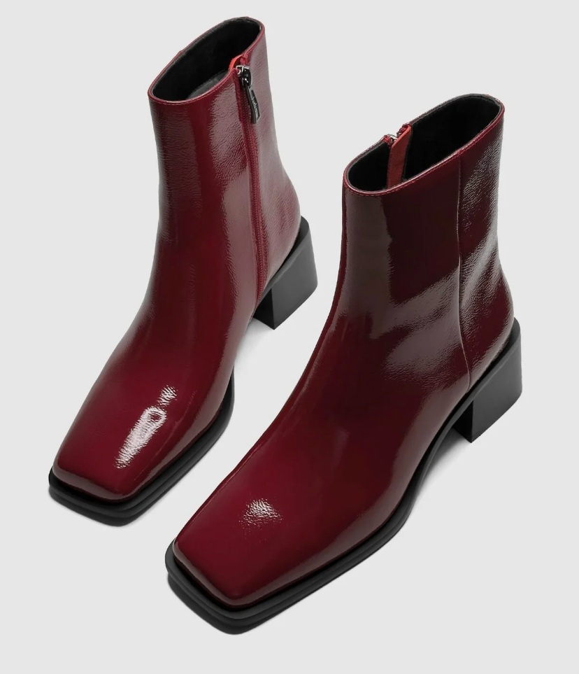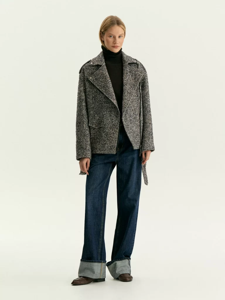 Выбираемся в офис или на бранч в трикотажном черном топе приталенного силуэта с v-образным вырезом, ботильонах из лаковой натуральной кожи в насыщенном оттенке бургунди и укороченной косухе из пальтовой ткани в «елочку». Добавляем серебряное кольцо и головной убор, например, пирожок из каракуля или шерстяную кепи.