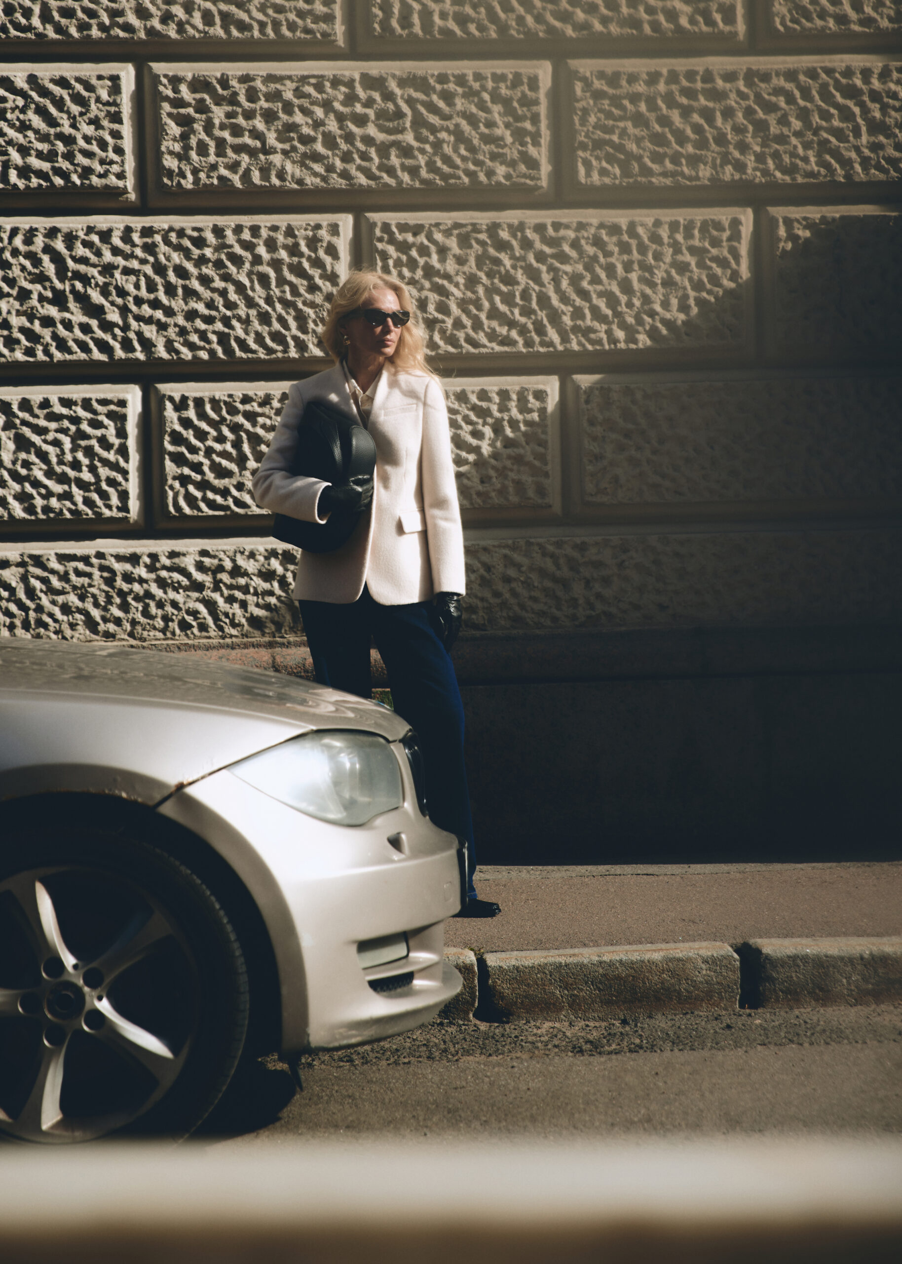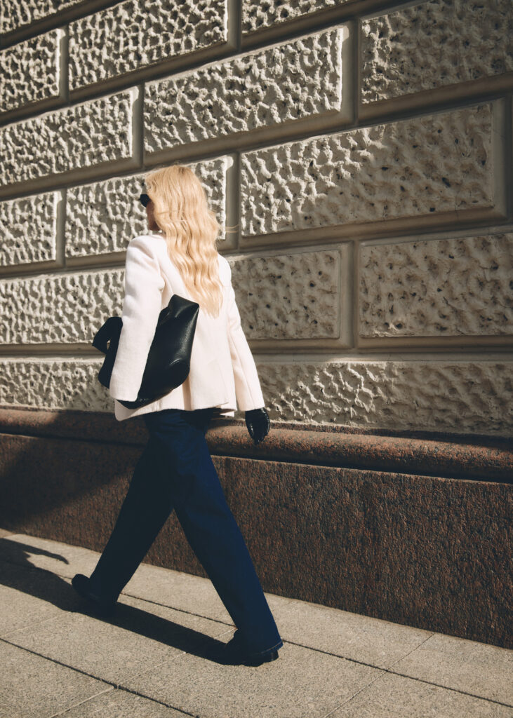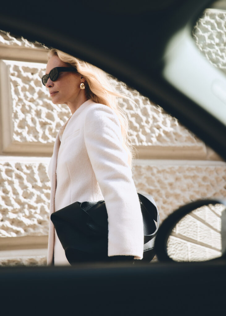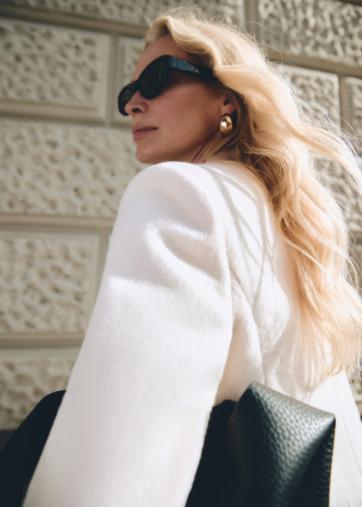 Мы же обратились к основе костюмной линии и выбрали полуприлегающий светлый жакет из костюмной ткани с шерстью альпака, V-образным вырезом и потайными кнопками. Материалы изделия надежно сохраняют тепло, а фасон и оттенок модели подходят для осенних образов в стиле quiet luxury. Все, как любит команда бренда: деликатность, аристократичность и неброская изысканность сопровождают коллекцию.